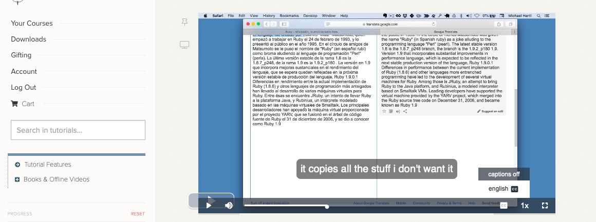 Michael Hartl here from the Rails Tutorial and Learn Enough. This is just a quick announcement that we’ve recently added closed captioning (sometimes called “subtitles”)1 to all Learn Enough video courses (including the Ruby on Rails Tutorial). The captions are available to all Learn Enough All Access subscribers (as well as to subscribers to the individual courses).