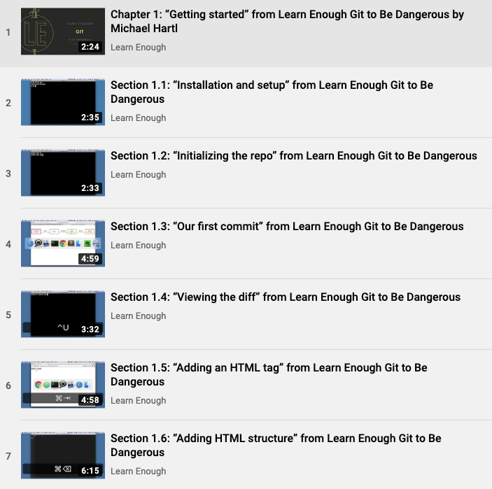 TL;DR: Check out the free Learn Enough Git videos on YouTube (Chapter 1 & Chapter 2).