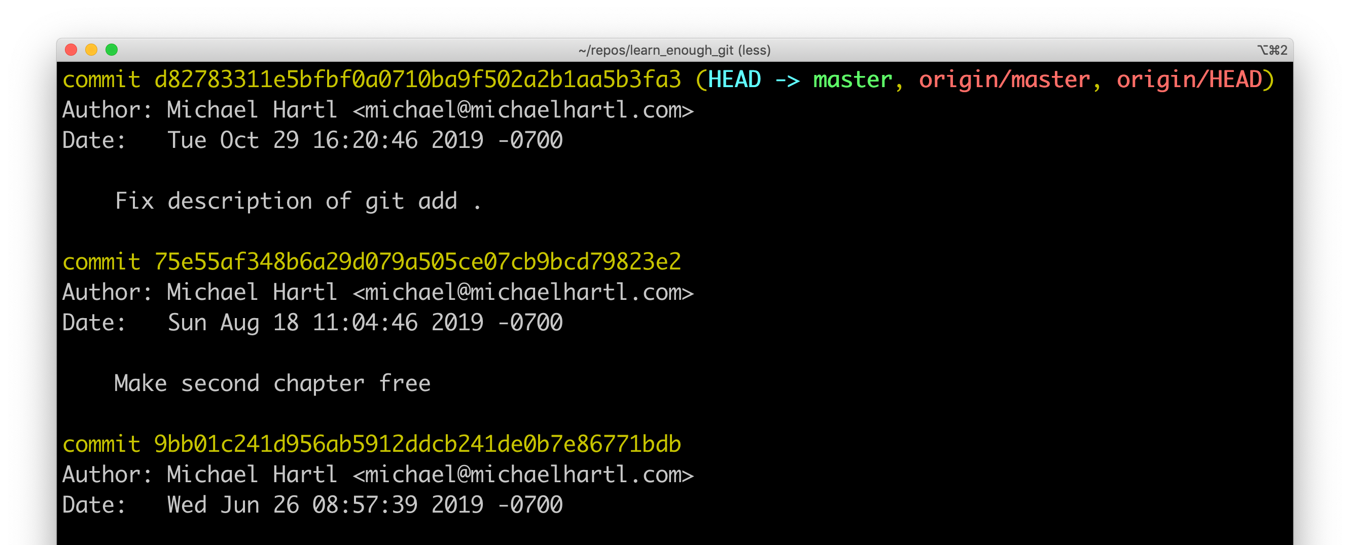 That’s it for the brief overview. You can find out a lot more by reading the free sample chapters of Learn Enough Git, and even more by getting the full tutorial.