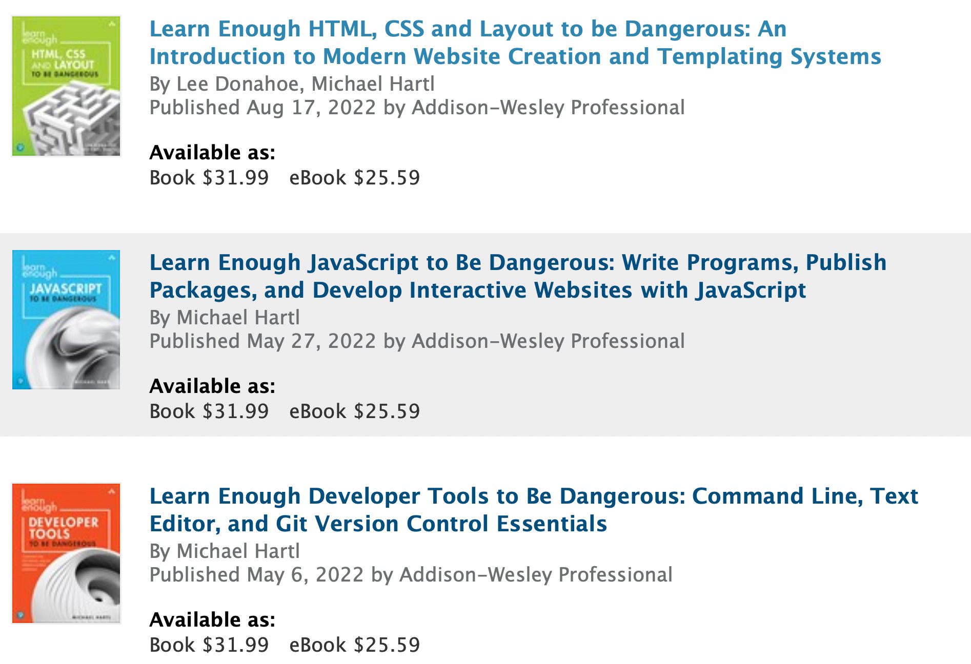 I’m now pleased to announce the availability of two more volumes, one combining the material from the Learn Enough tutorials on HTML and CSS & Layout and another with the contents of our JavaScript tutorial. That brings the number of print versions to three (the links are to InformIT, Pearson’s direct-sales website):1