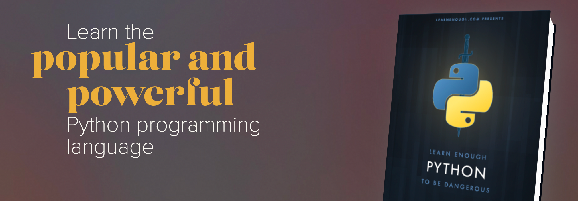 Although available as a standalone course, the best way to get Learn Enough Python to Be Dangerous is with the All Access subscription, which includes all of its prerequisites as well as the full Ruby on Rails Tutorial. The print edition and ebook are also available directly from the publisher at InformIT.