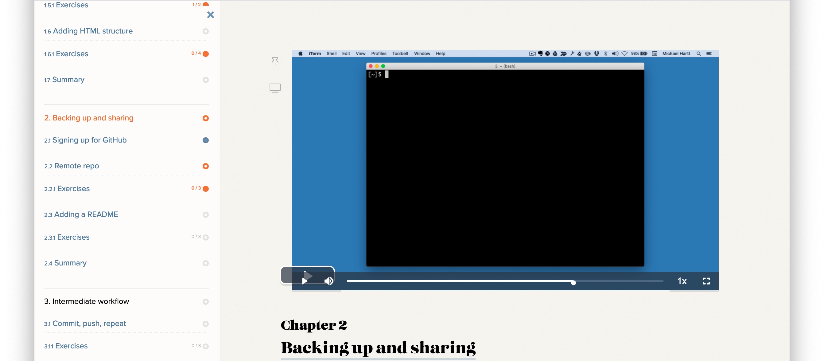 The discussion above suggests another possibility, though: just start with whichever tutorial looks most interesting or best seems to match your experience level. Whenever you run into something you don’t know, follow the cross-reference to learn about that particular subject, and maybe even decide to follow the earlier tutorial in its entirety. You can go then back and finish the one you first started. The Learn Enough course progress tracking (Figure 6) makes it especially easy to pick up where you left off.